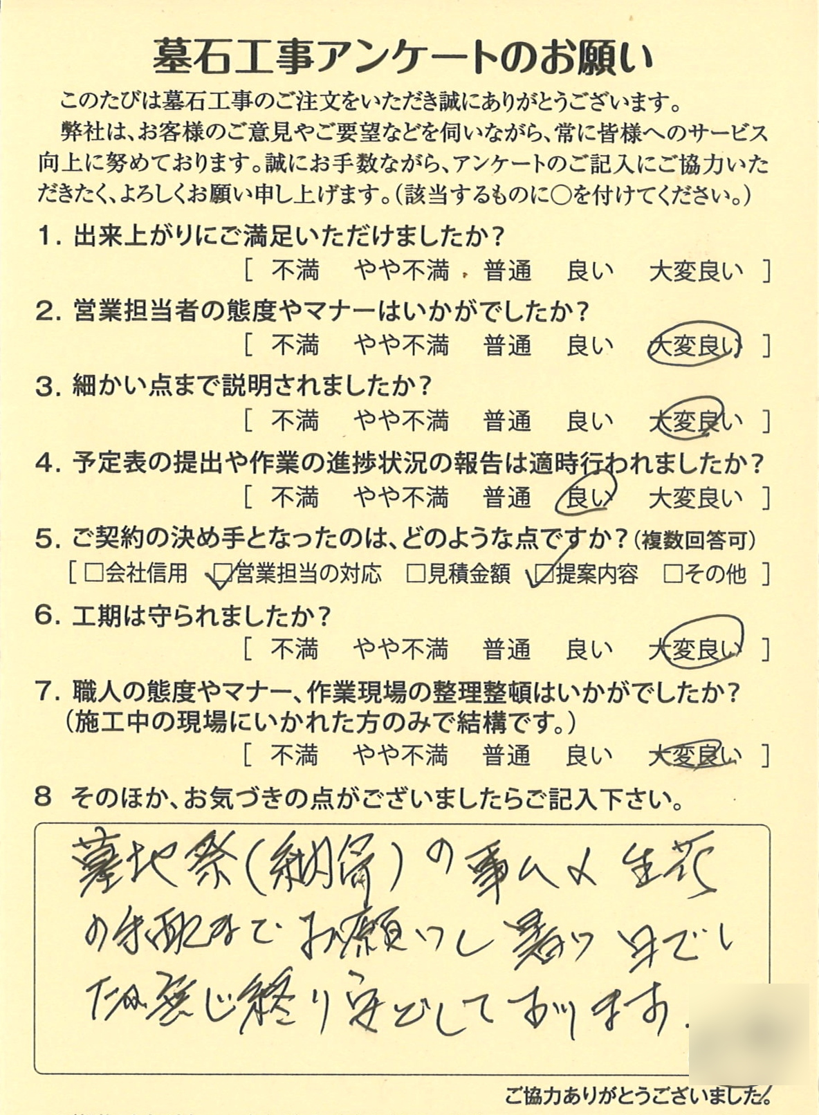 担当営業の対応や提案内容、また猛暑日の納骨時の生花の手配に感謝のコメントも頂きました。