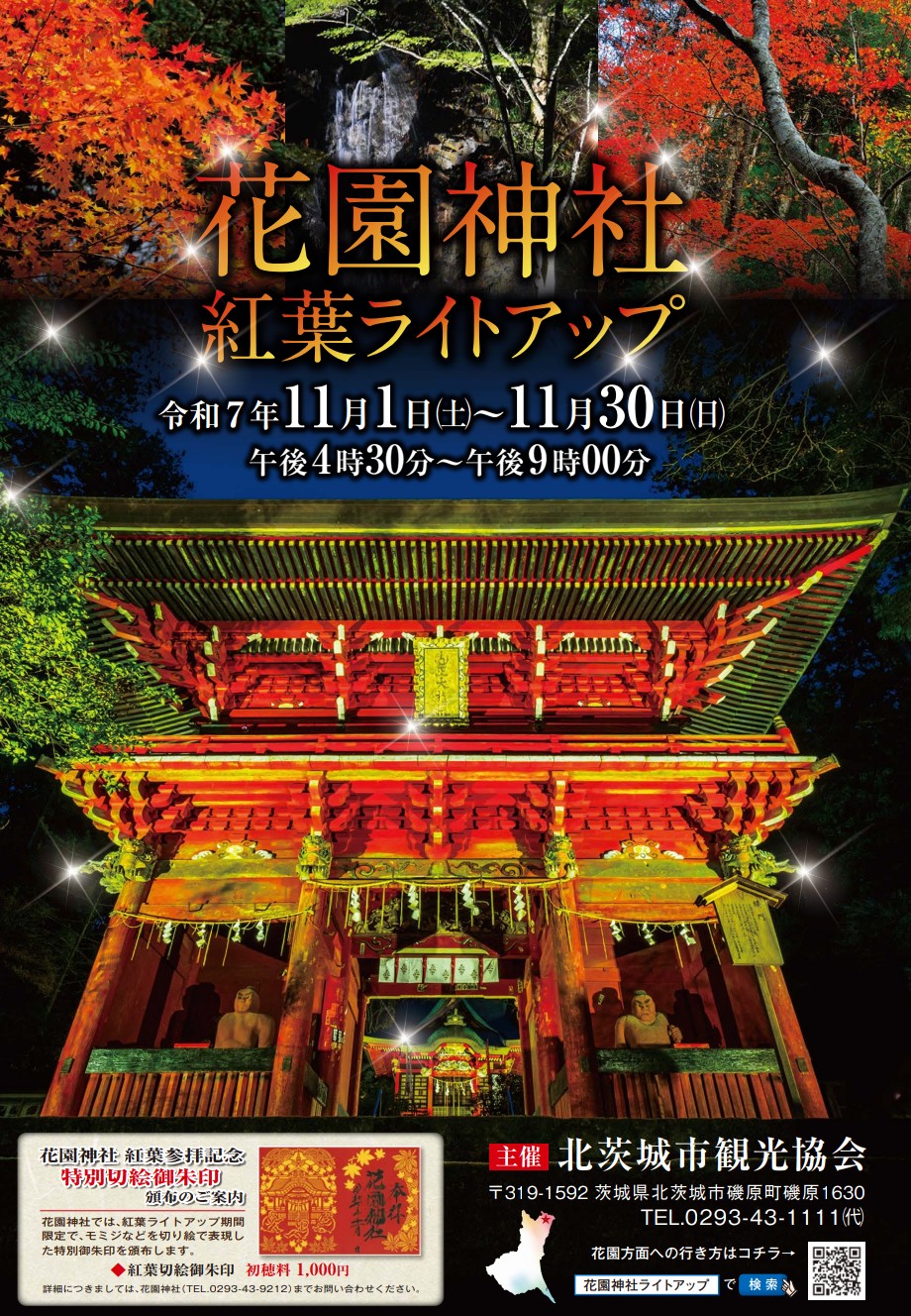 花園神社 紅葉ライトアップ 2025年11月14日北茨城展示場 北茨城市華川町の花園神社にて紅葉ライトアップが開催されています。神社と紅葉のライトアップでとても幻想的です。期間限定で特別切絵御朱印もいただけるそうです。期間:11/1(土)~11/30(日)