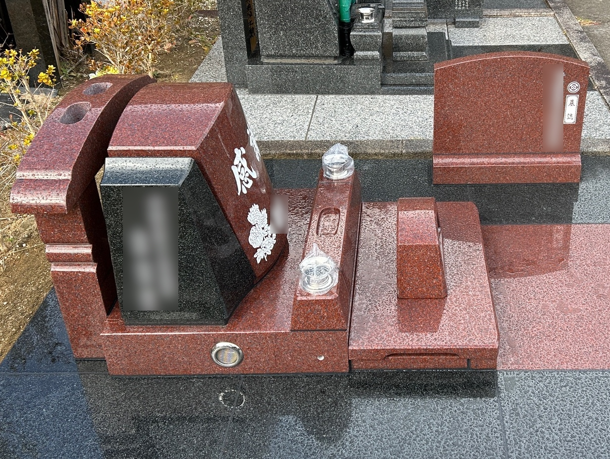 ●日立市K様 ●鞍掛山霊園 ●4.7㎡ ●赤と黒 ●菊の花の彫刻が映える明るい仕上がり