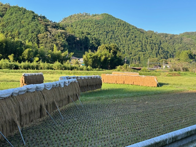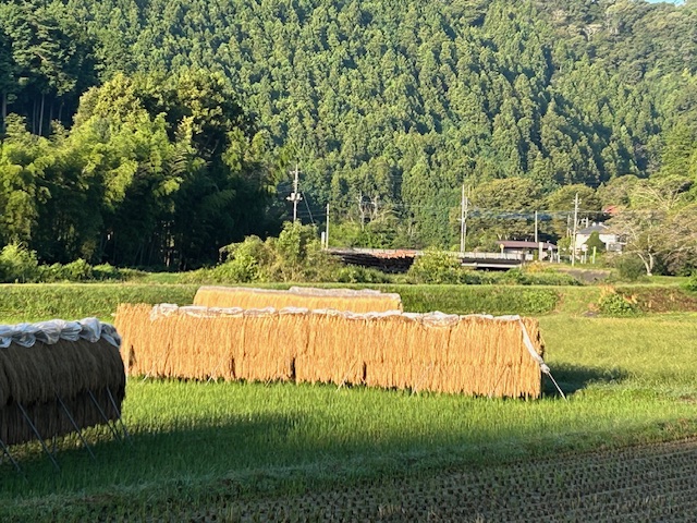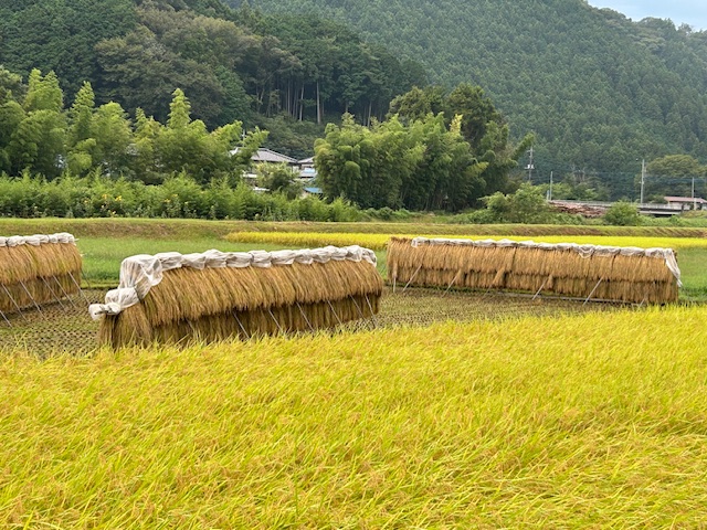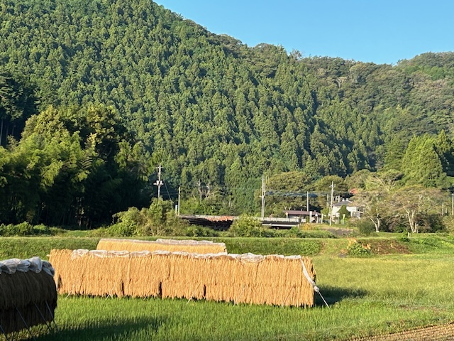 秋の風景 2025年09月26日日立展示場 山あいでも、今ではコンバインで稲刈りをする農家さんが増えました。おだがけは、かなり減りましたので、減りゆく秋の風景です。黄金色の稲の上を一面赤とんぼが舞う風景も、今では見ることができません。