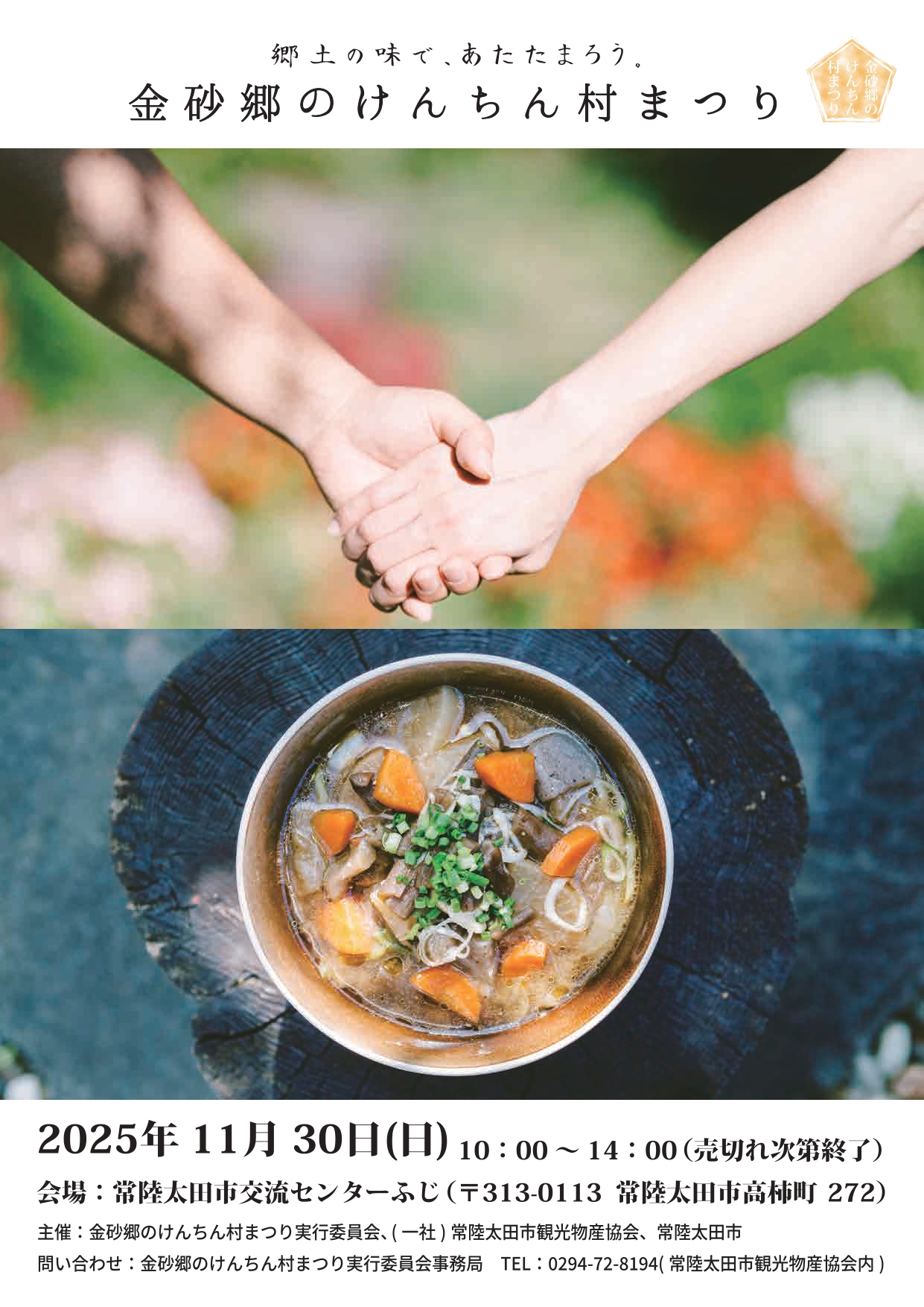金砂郷のけんちん村まつり 2025年11月28日日立展示場 日時:11/30(日)10:00~14:00(売り切れ次第終了) 会場:常陸太田市交流センターふじ ●第6回つけけんちん大食い大会 11時~ ●けんちん汁食べ比べコーナー ●特産物販売