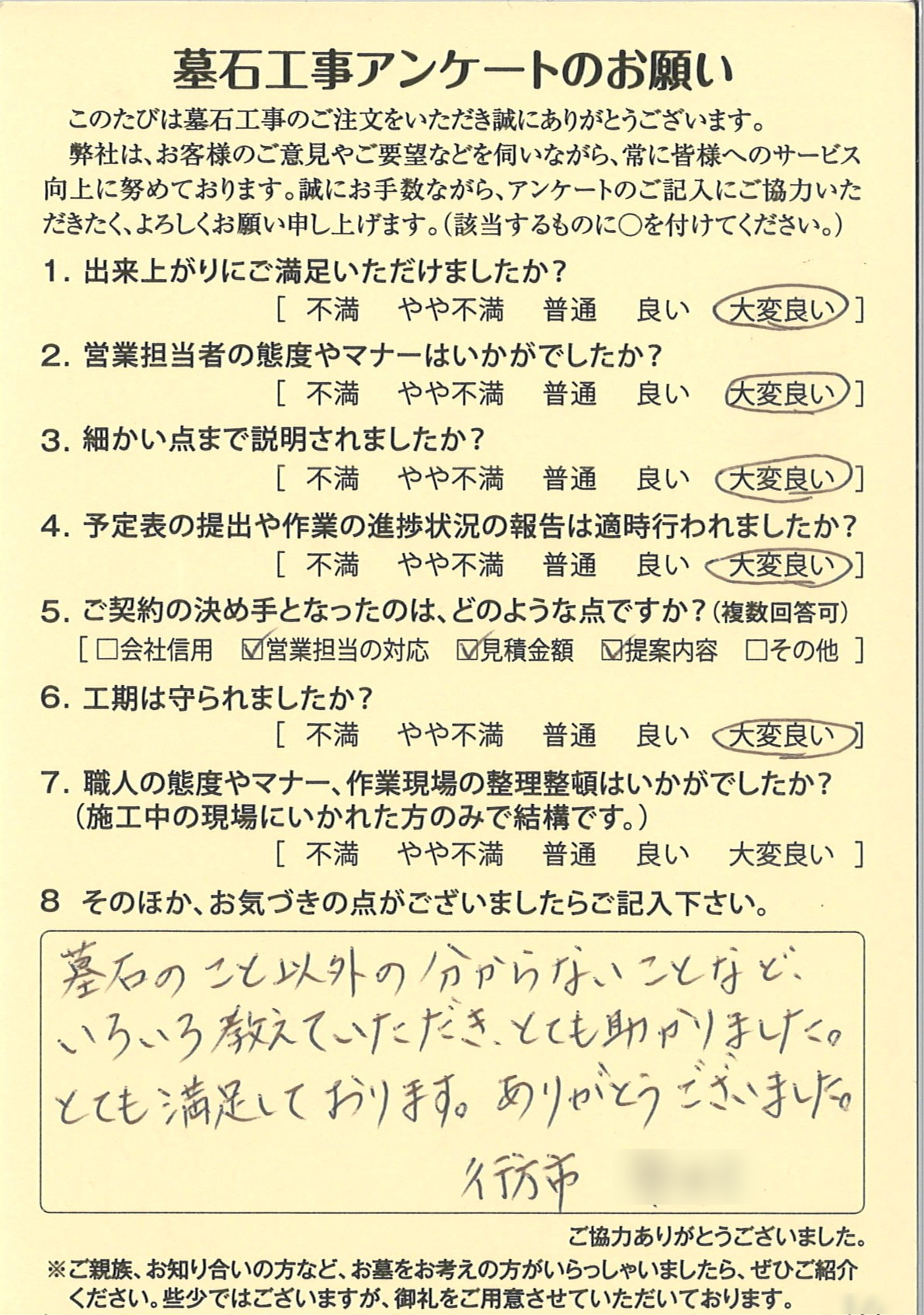 行方市Ⅰ様より建墓後の工事アンケートが届きました。