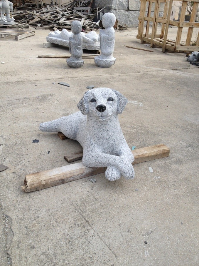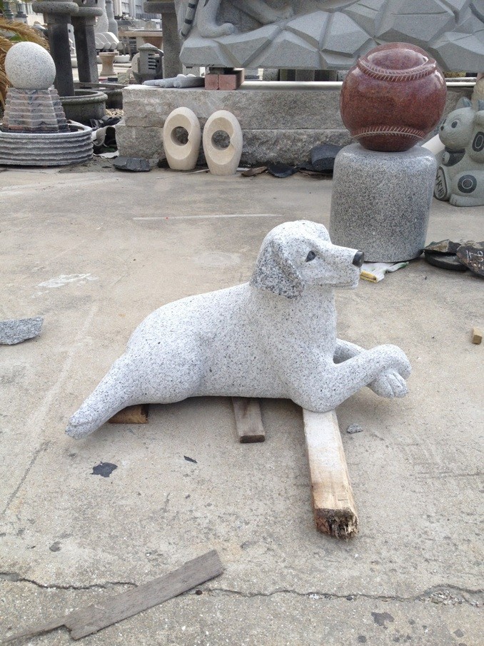 何度も調整を繰り返し完成した石の置物、ワンちゃんの毛並みや表情など