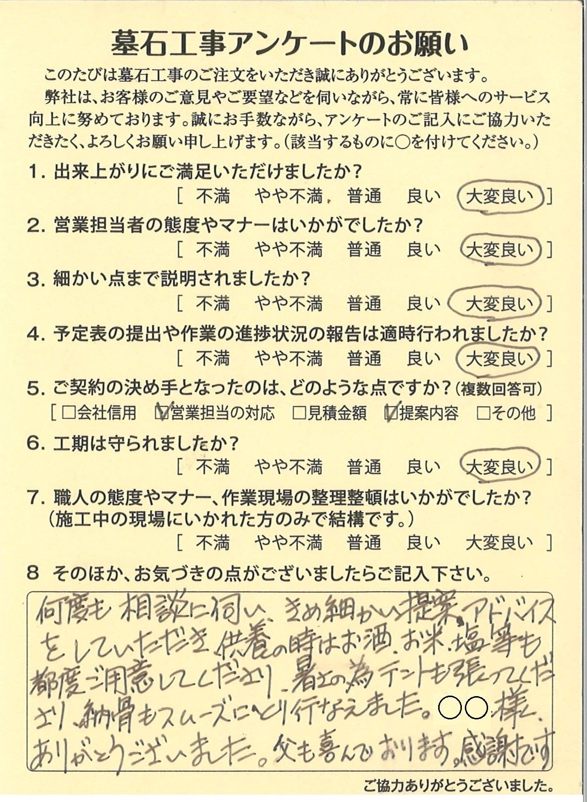 寺院墓地(3.4㎡)にお墓を建てて頂きました小山市Y様からのアンケートをご紹介いたします。