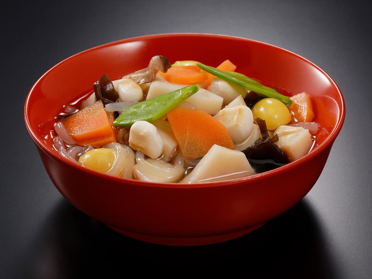 干し貝柱でだしをとり、里芋や人参、糸こんにゃくなど具だくさんでつくる煮物。